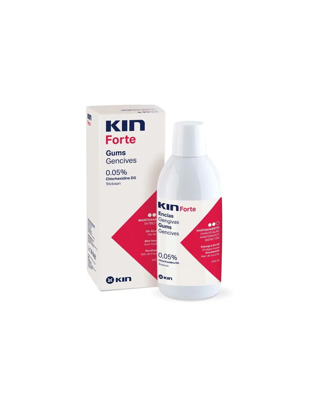 El enjuague bucal KIN Forte Encías, gracias a sus ingredientes digluconato de clorhexidina, triclosán, y lactato de zinc, aporta beneficios en pacientes con patologías gingivales.