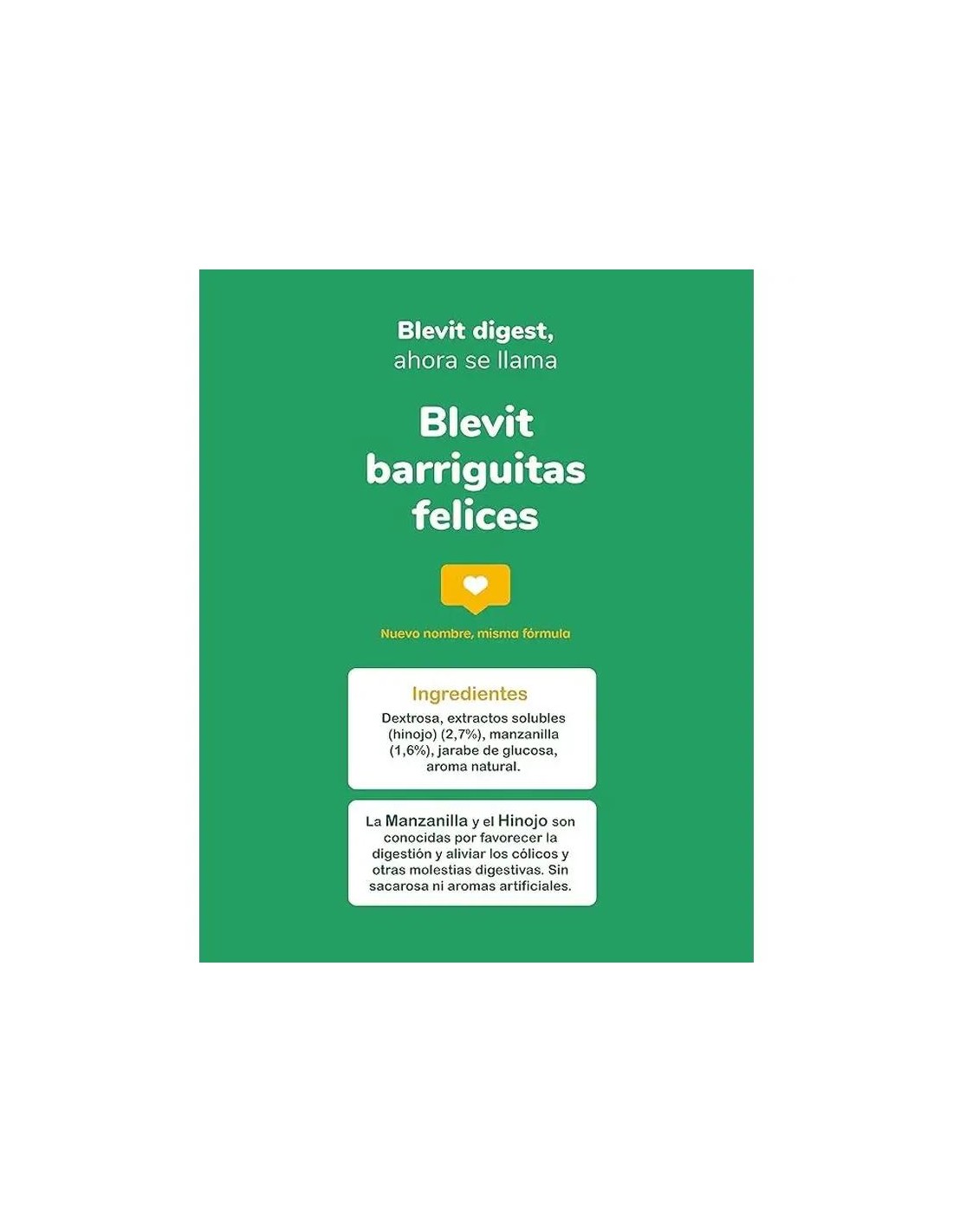 Blevit Barriguitas felices contiene hinojo y manzanilla, por lo que resulta la infusión de elección en casos de trastornos digestivos leves como el cólico, o el meteorismo que pueden causar malestar e intranquilidad en el bebé, ya que facilita la expulsión de los gases acumulados. También resulta de gran utilidad en digestiones lentas y pesadas, aliviando las molestias digestivas y favoreciendo el descanso y relajación.