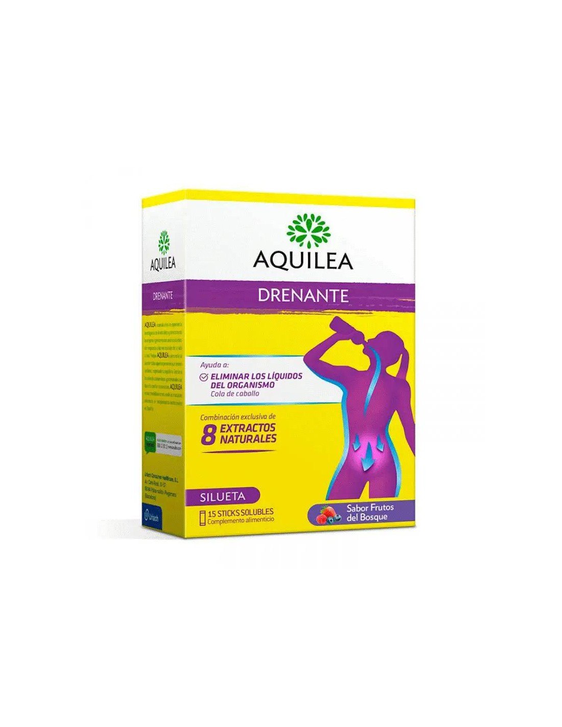 Aquilea Drenante es un complemento alimenticio fabricado en formato de sticks solubles en agua para ayudar con la retención de líquidos. Desarrollado por la marca Aquilea usando un fórmula única de 8 extractos naturales.