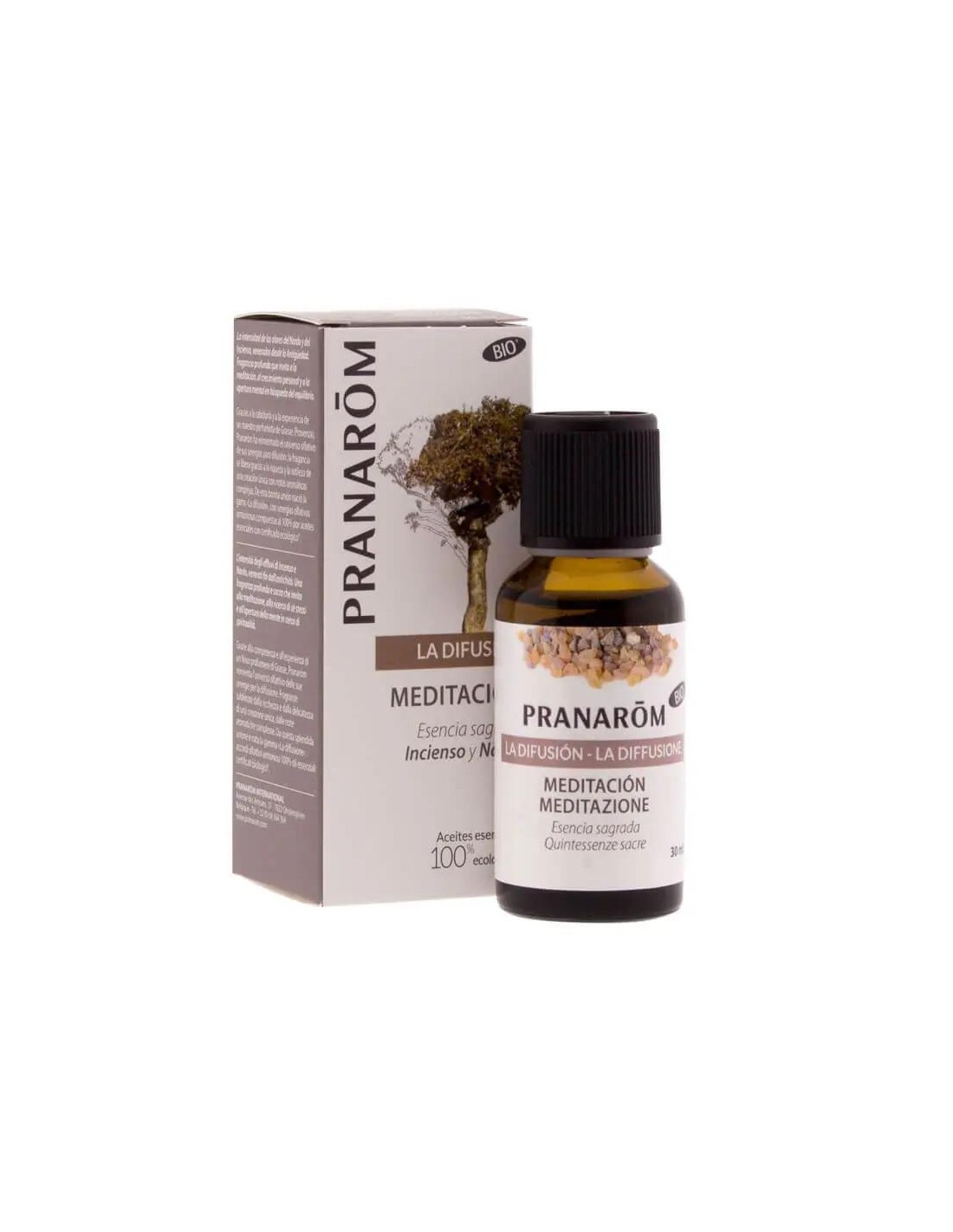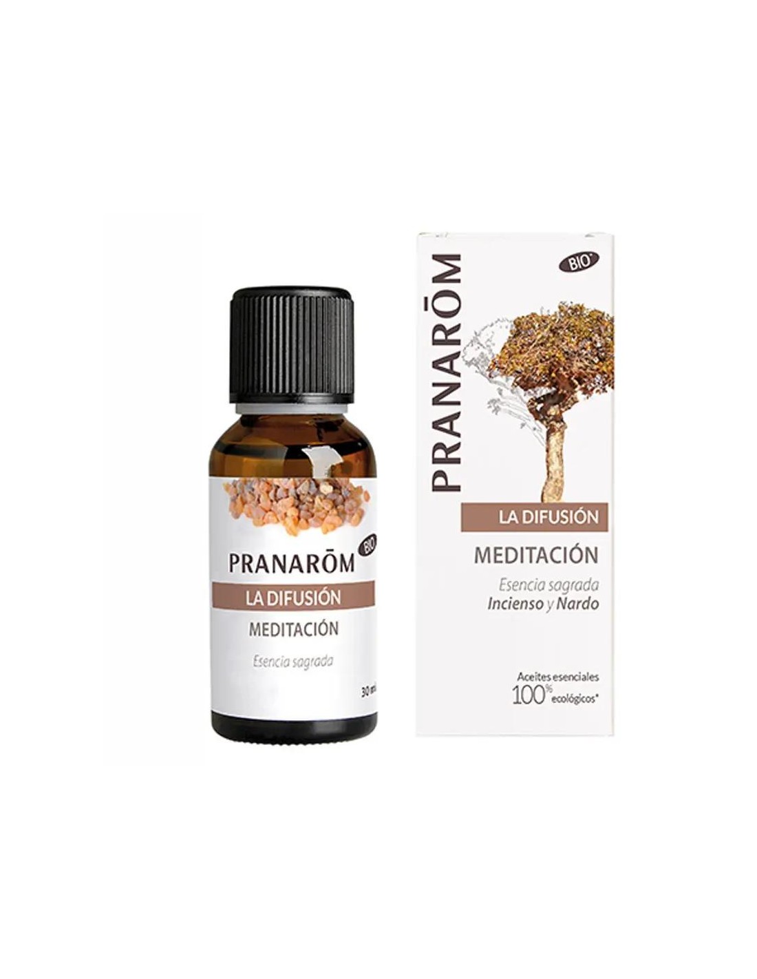 Pranarom La Difusión Meditación en envase de 30 ml es un producto hecho con aceites esenciales naturales que favorecen la relajación, el buen estado de ánimo y la conexión con el interior de las personas. Está formulado con la amargura espiritual del nardo, el frescor de los cítricos y notas agradables de especies misteriosas.