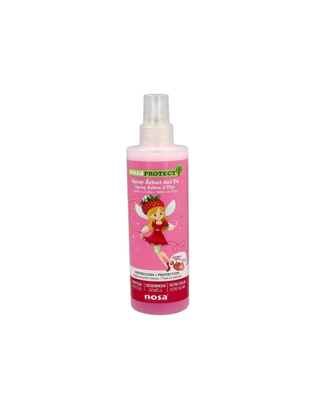 Nosa spray desenredante árbol del té rosa es un producto para el cabello de las niñas y los niños que facilita el peinado y ayuda a mantenerlo libre de piojos. Ejerce un efecto desenredante y suavizante en el pelo gracias a su fórmula bifásica, la cual elimina los nudos al instante. Contiene un filtro solar para mantener el cabello protegido contra los rayos solares, el calor y las agresiones externas. Está formulado a base de aceite del árbol de té, que actúa evitando la infestación por piojos en el cabello. Es un producto que no necesita aclarado, por lo que funciona como una barrera natural. El desenredante Nosa tiene un agradable aroma a fresa que disimula por completo el olor característico del árbol de té. Al no necesitar aclarado, las partículas del árbol de té y la dimeticona siguen actuando como una barrera natural para proteger el pelo y el cuero cabelludo. Es un producto para niños y niñas dermatológicamente testado, apto para pieles sensibles.