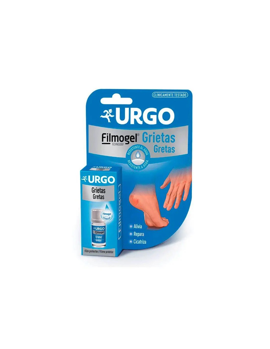 El apósito líquido para grietas con filmogel está indicado como una solución para tratar las grietas de pies y manos .