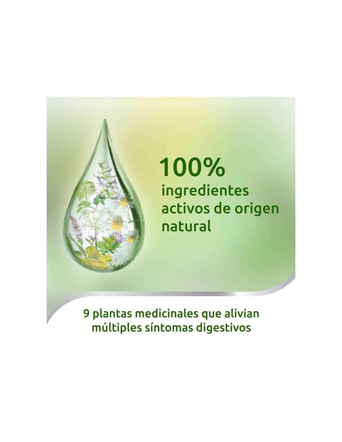 Está formulado a base de extractos líquidos etanólicos de carraspique blanco, raíces de angélica, flores de manzanilla, frutos de alcaravea, frutos de cardo mariano, hojas de melisa, hojas de menta, celidonia y raíz de regaliz.