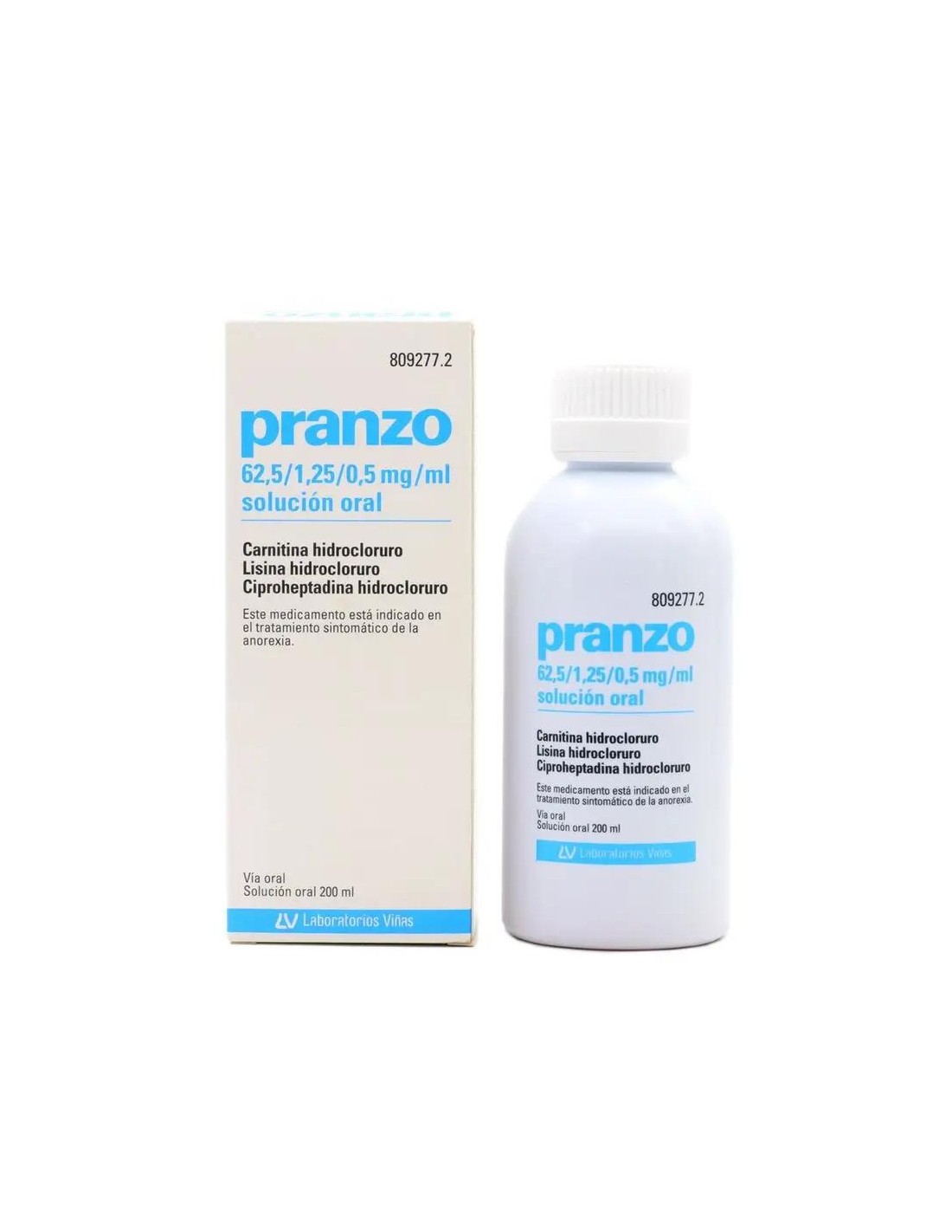 Los principios activos de Pranzo solución oral son: carnitina hidrocloruro, lisina hidrocloruro y ciproheptadina hidrocloruro. Cada ml de solución oral contiene 62,50 mg de carnitina hidrocloruro, 1,25 mg de lisina hidrocloruro y 0,50 mg de ciproheptadina hidrocloruro.