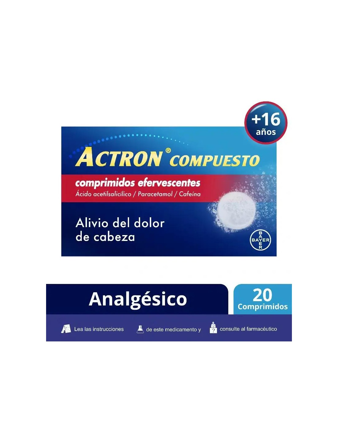 ACTROEs un medicamento en forma de comprimidos efervescentes formulados con ácido acetilsalicílico, paracetamol y cafeína, tres principios activos que se utilizan para el tratamiento del dolor moderado en adultos y adolescentes a partir de 15 años o 40 kg de peso. Se presenta en un envase de 20 comprimidos efervescentes . ¿Qué es Actron, para qué sirve?