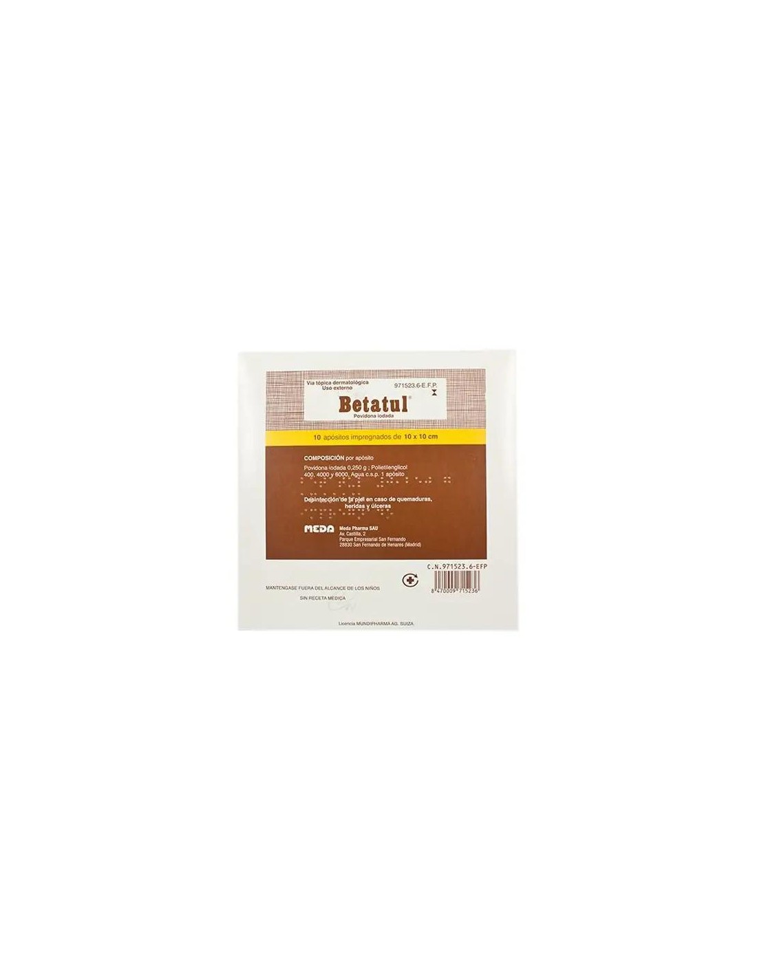 El principio activo de Betatul es la povidona iodada. Cada apósito impregnado de gel de 10 x 10 cm contiene 250 mg de povidona iodada. El resto de excipientes son: polietilenglicol 400, polietilenglicol 4000, polietilenglicol 6000, agua purificada y gasa hidrófila.
