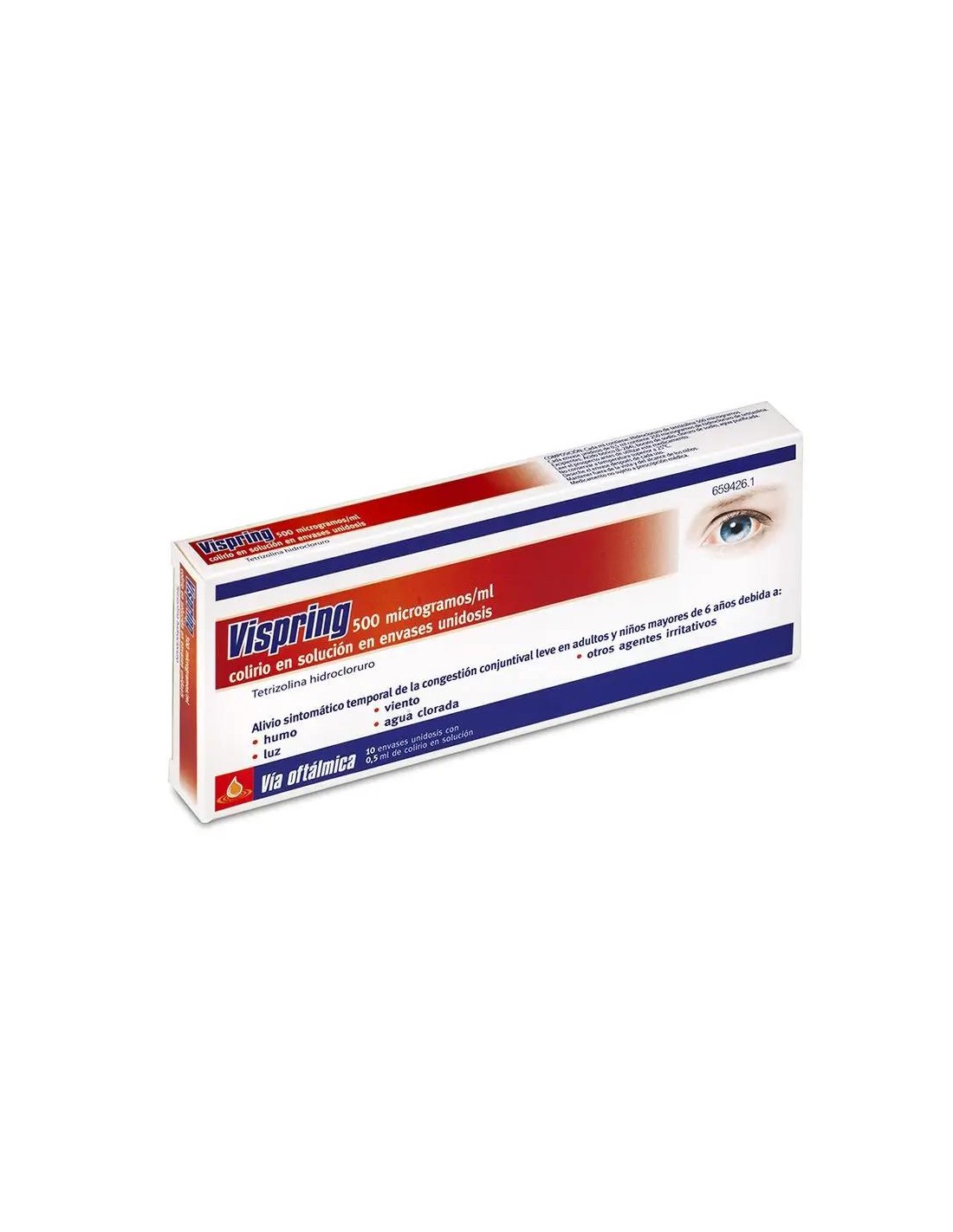 Cada ml de colirio Vispring monodosis contiene 500 mg de tetrizolina hidrocloruro como principio activo principal de este medicamento. El resto de excipientes son: Ácido bórico (E-284), borato de sodio, cloruro de sodio, edetato disódico, cloruro de benzalconio y agua purificada.
